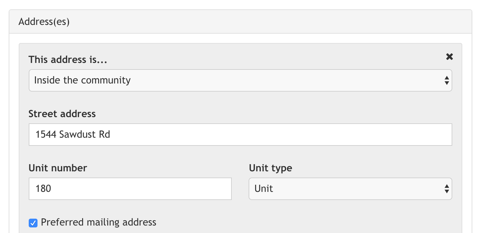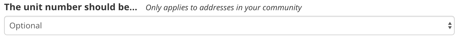 One of the options you’ll have is whether the unit number field is required, optional, or hidden for addresses inside your community. Condominiums will typically require this field to be filled out, while neighborhoods of just houses will often hide this field entirely.
