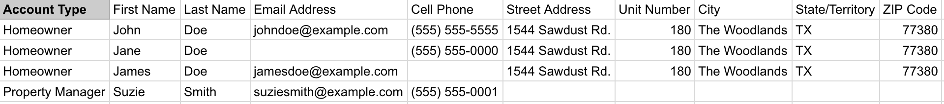 In the example below, John, Jane, and James Doe will all be imported into the same account since they share the same account type and physical address. Suzie Smith, however, has a different account type and will have a separate account created.