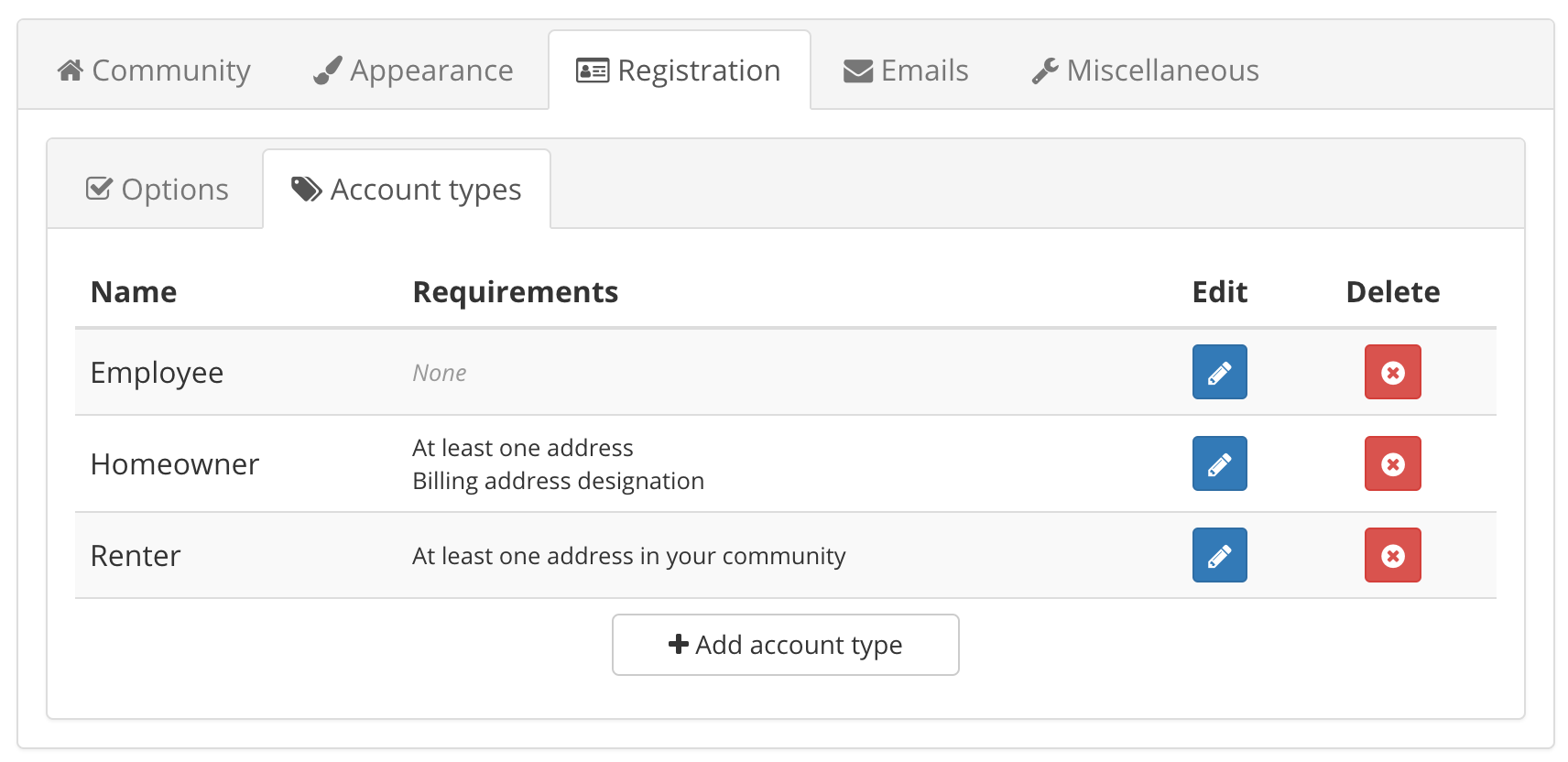 For each account type you create, you can also set specific address requirements. This will determine what address information (if any) is needed when creating that type of account.