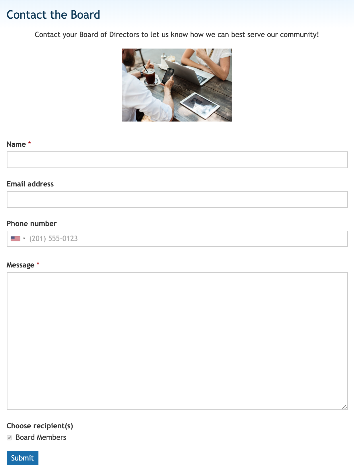 To do this, we recommend adding a "Contact Form" page to your website, where members can submit their feedback and questions directly to the board.