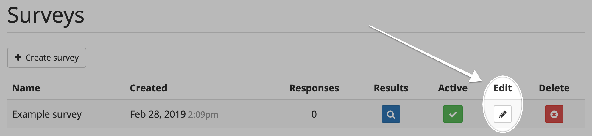 Need to revise an existing survey? You can now edit surveys after they've been created! Before responses are provided, you can edit every aspect of the survey. After one or more responses have been provided, just the survey title and introduction are editable.