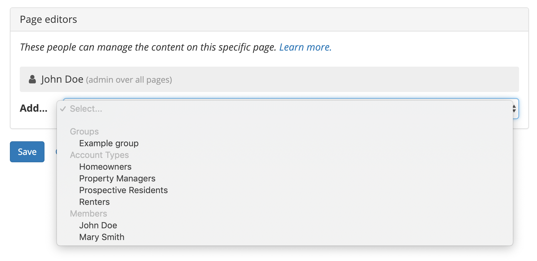 In addition to being able to specify individual members as page editors, you can now add groups and account types as page editors. No need to duplicate a list of members if you've already defined them as a group or if they're all within one particular account type.