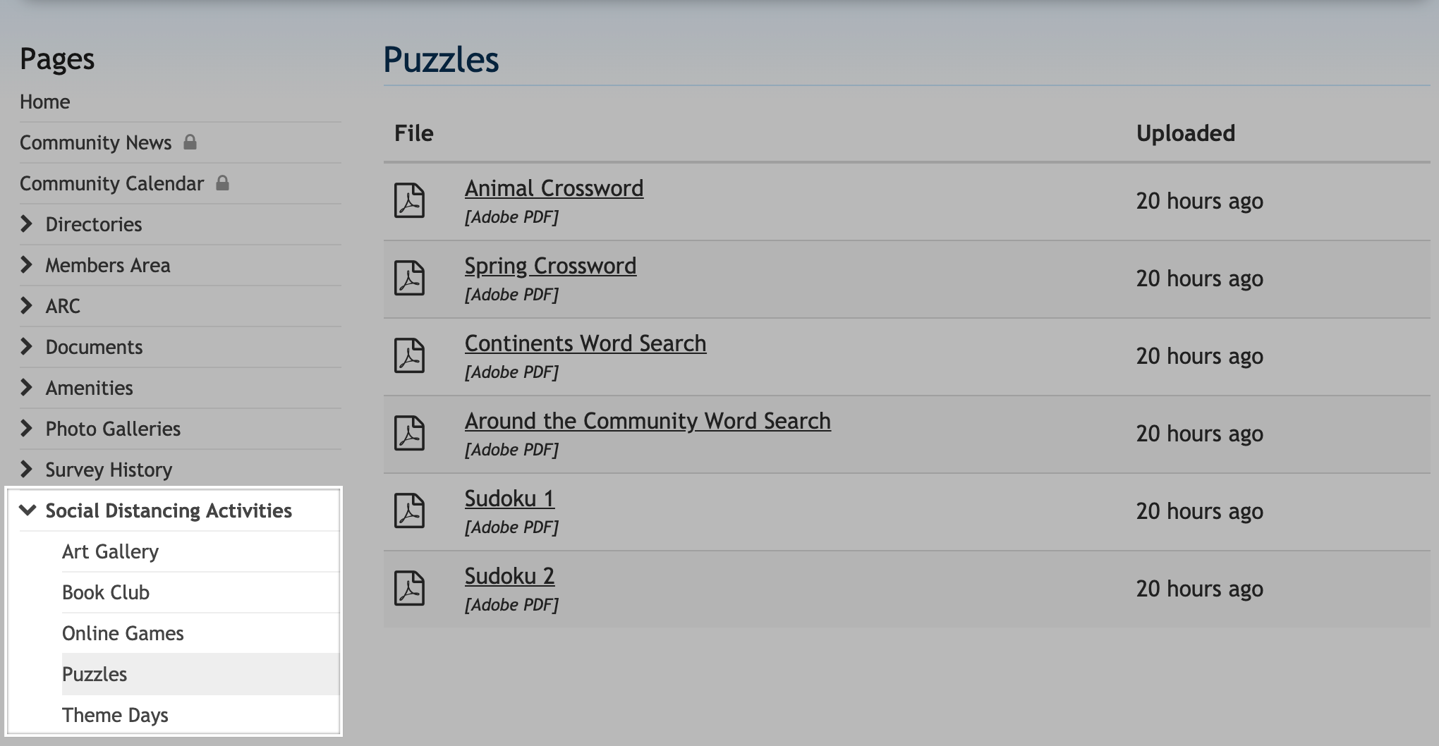 For the members that enjoy mind-stimulating puzzles, you can upload crossword puzzles, word searches, and Sudokus for them to print out and complete. We recommend creating a "Documents" page to upload the puzzles, then grouping this page into a folder, like in the screenshot below. This way, members can easily find and access them from your website!