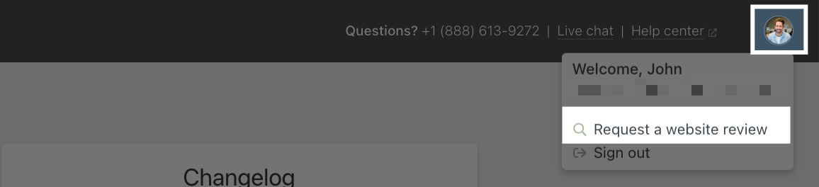 Our review process is straightforward, with three easy steps. To begin, an administrator will first visit the Admin Portal and click on the user icon in the upper-right-hand corner. Next, select "Request a website review" from the dropdown menu.