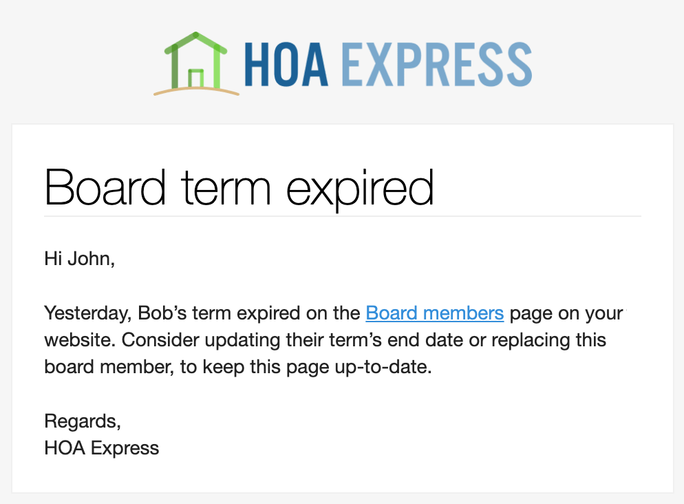 Community websites work best when the information is kept up-to-date, so we've introduced a handy reminder to help you do that for board members! If you provide an optional term expiration date, in addition to being helpful for residents to see, we'll now use that information to send admins an automatic reminder email if the term expires. If you receive this email, it's time to update the list of board members on your website!
