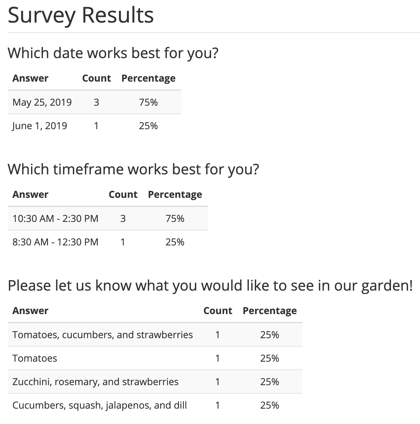 To help gather a large number of volunteers from your community, we recommend creating a survey on your website to find out what time and date works best for everyone. You could also include a question about what fruits, vegetables, herbs, or plants are most wanted in the garden. We’ve included an example of what this survey could look like below: