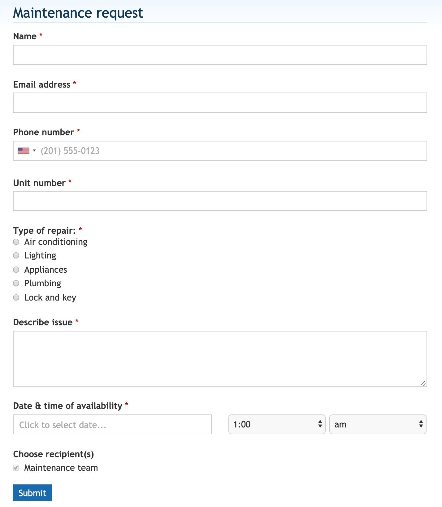 Another way you can use less paper is by digitizing your community forms. For example, rather than having your members fill out a paper maintenance request form, you could create that same form on your website using our “Custom Form” page type. With this page, you can create the fields that need to be filled out by the members. They can then complete and submit the form to the designated recipient(s) to be received via email. This completely eliminates the use of paper to complete this process! Below we've included an example of what this form could look like:
