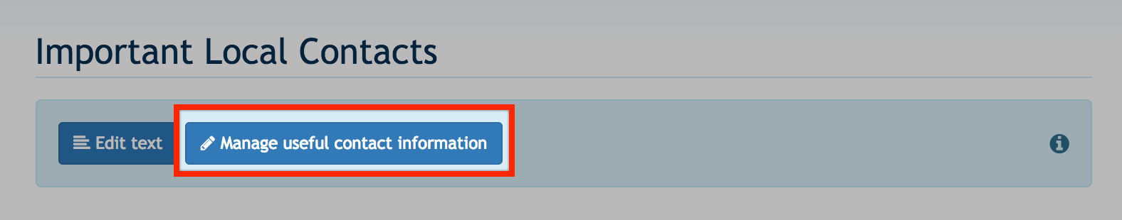 Administrators with the “pages” privilege and page editors can add and manage the content on this page. To update the page, you’ll want to click on the dark blue “Manage useful contact information” button in the light blue admin box.