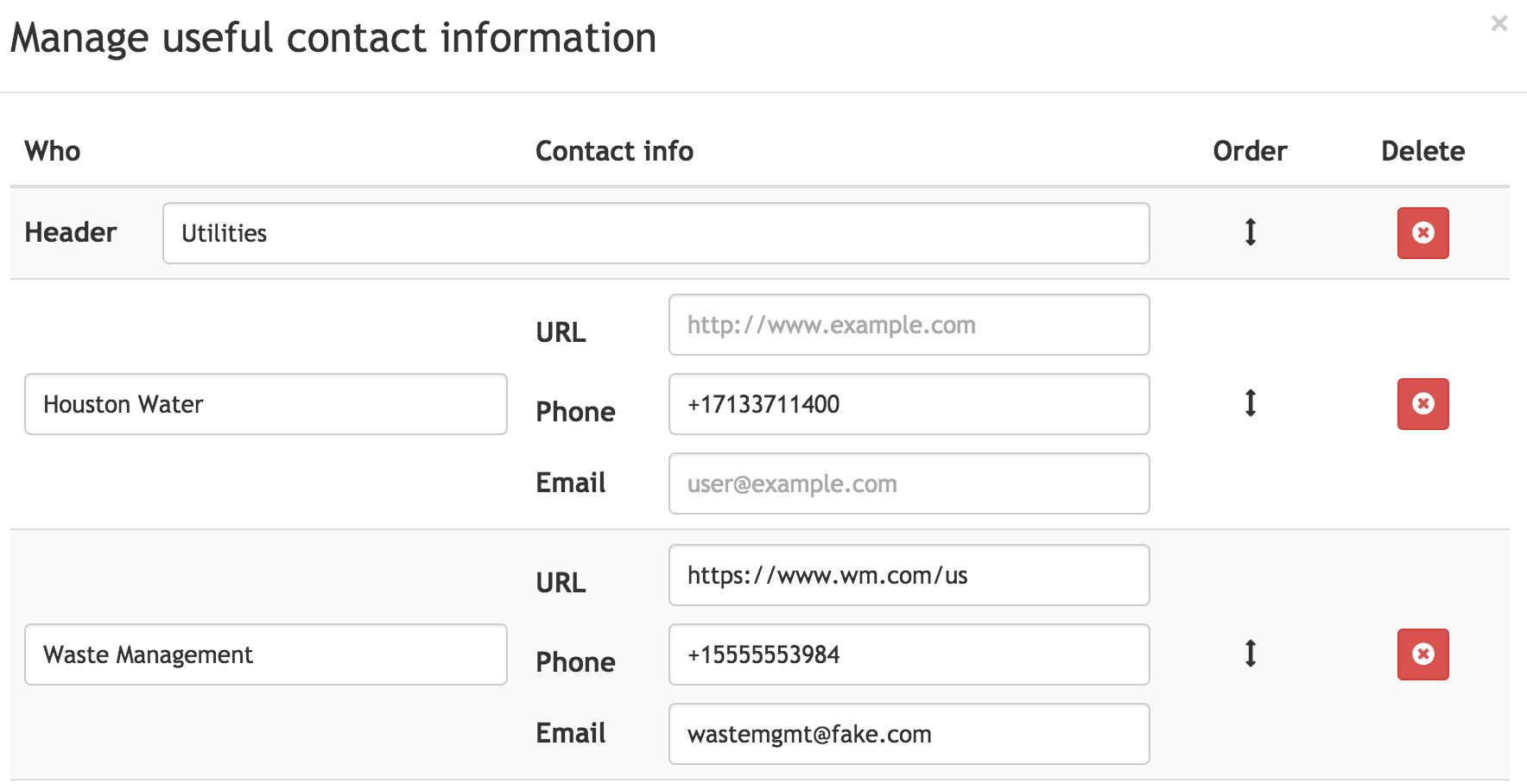 After you’ve created your page, it’s time to add content to it! This page type has built in tools to help you easily organize the information you add with section headers. This way, you can group together similar contacts. In the example provided below, we’ve added the section headers, “Utilities” and “Emergency Services” and listed corresponding contact information below them.