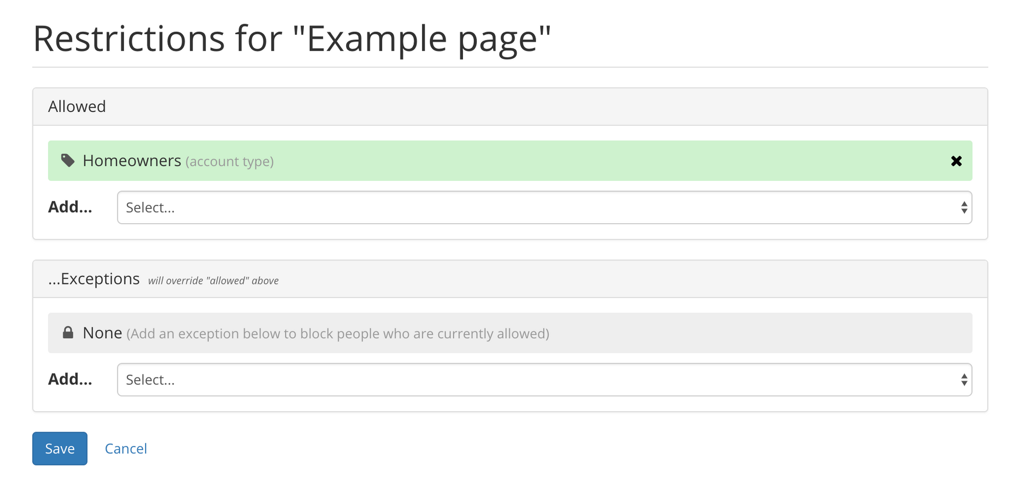 Administrators can set page restrictions to allow only certain account types to access certain pages. For instance, if you only wanted homeowners to access a page, you could set the page restrictions so only accounts registered with the account type “Homeowner” could log in and view the contents of the page.
