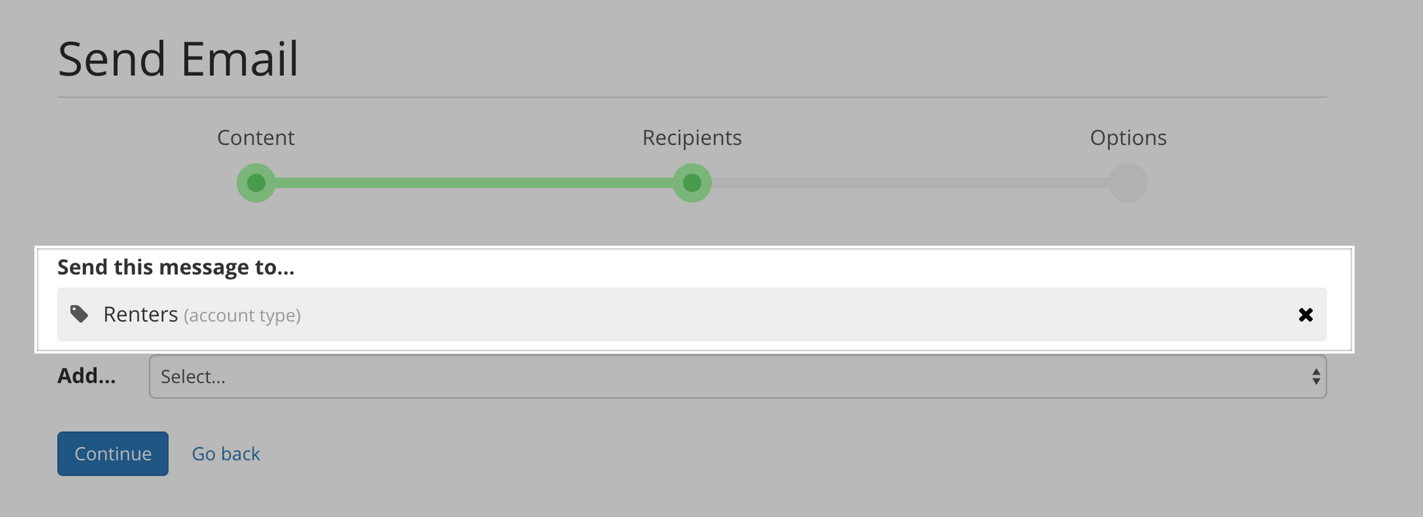 In the “Communications” section, blast emails, text messages, and mailed letters can be sent to specific account types as well. For instance, if you had an email that only applied to renters in your community, you could select for that message to only go out to accounts registered with the account type “Renter.”