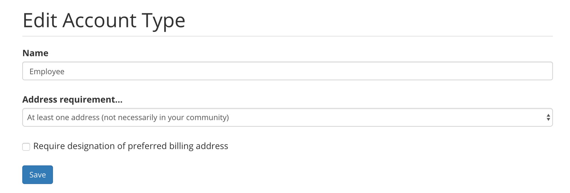 Full administrators will have the ability to edit an existing account type at any time from the “Settings” section in the Admin Control Panel. In here, you can change the name of an account type and its address requirement.
