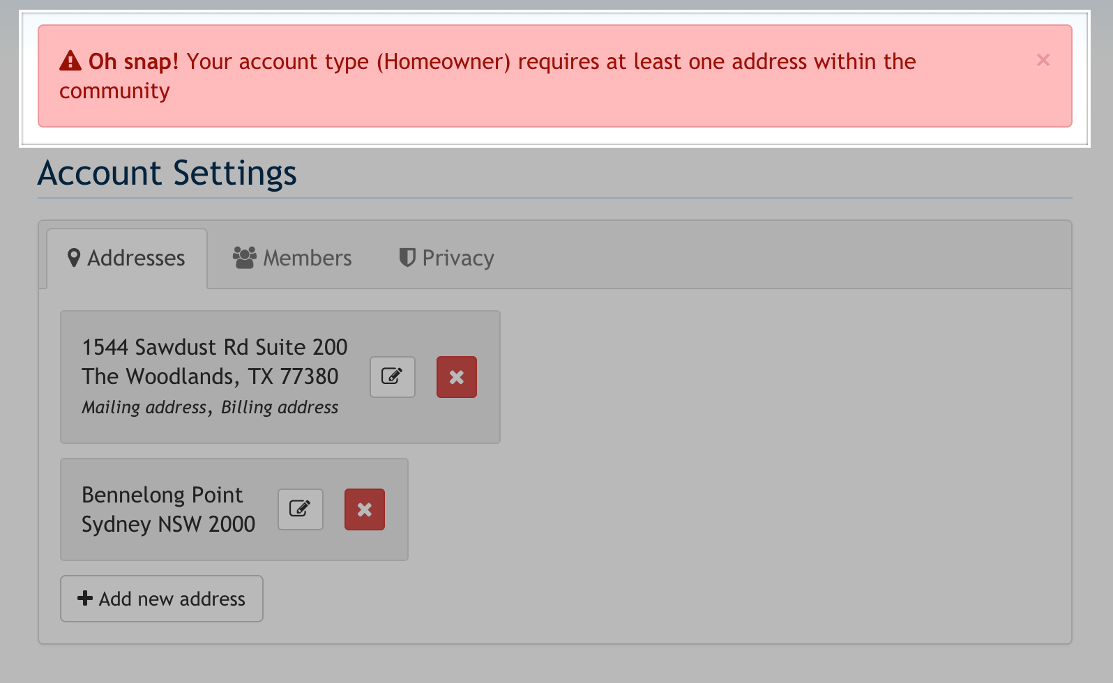 For example, say an account type was edited so at least one address had to be located inside of the community. If a member with that account type then tries to delete the address that meets this requirement, our system would not let them complete this action. This way, their account meets the updated address requirement for that account type.